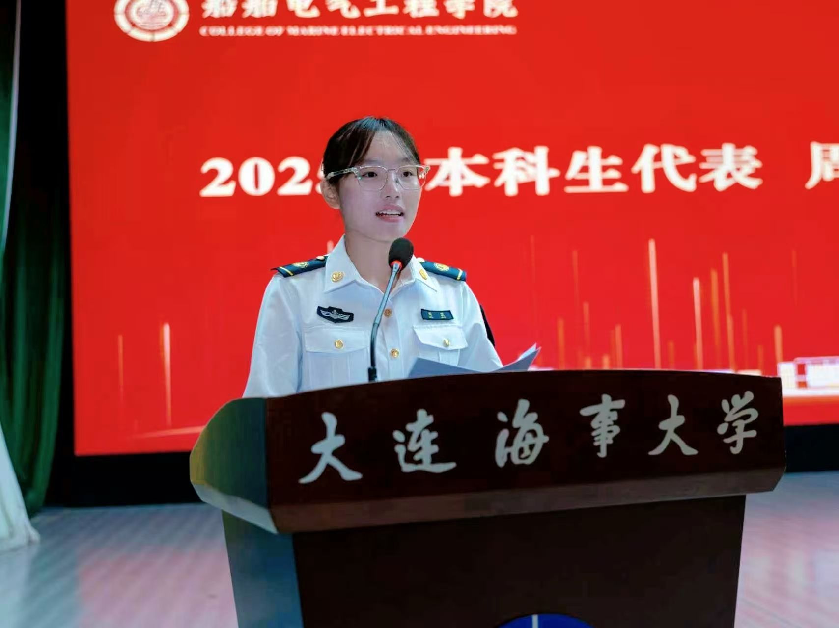 教师代表申丽然深情寄语,她勉励同学们心怀“蓝色梦想”,树立鸿鹄之志,将个人的理想融入国家海洋强国建设的大局;精进“专业技能”,练就过硬本领,在实验、实训、科创项目中锻炼解决复杂工程问题的能力;勇于“探索创新”,敢于挑战未知,在挑战未知中激发潜能,培养批判性思维和创新能力;注重“全面发展”,涵养健全人格,成为有温度、有情怀、有担当的时代青年。